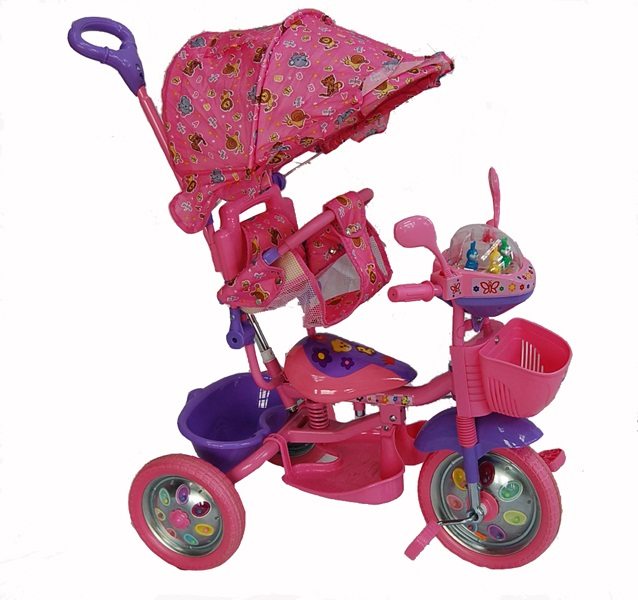 Трехколесный велосипед 209 C2 оборудован ручкой управления, тентом и подножками, что позволяет использовать его как прогулочную коляску для малыша.