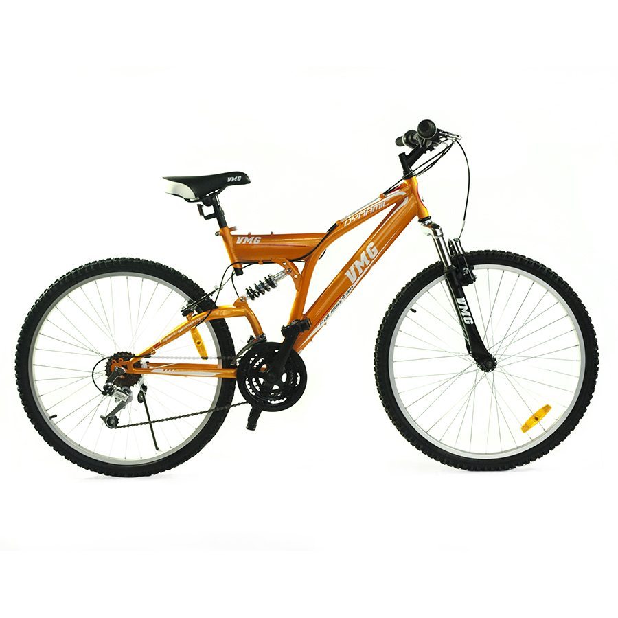 Горный велосипед VMG Dynamic 26 оборудован 2 амортизаторами. Велосипед имеет прочную стальную раму, 26 диаметр колеса и 18 скоростей.