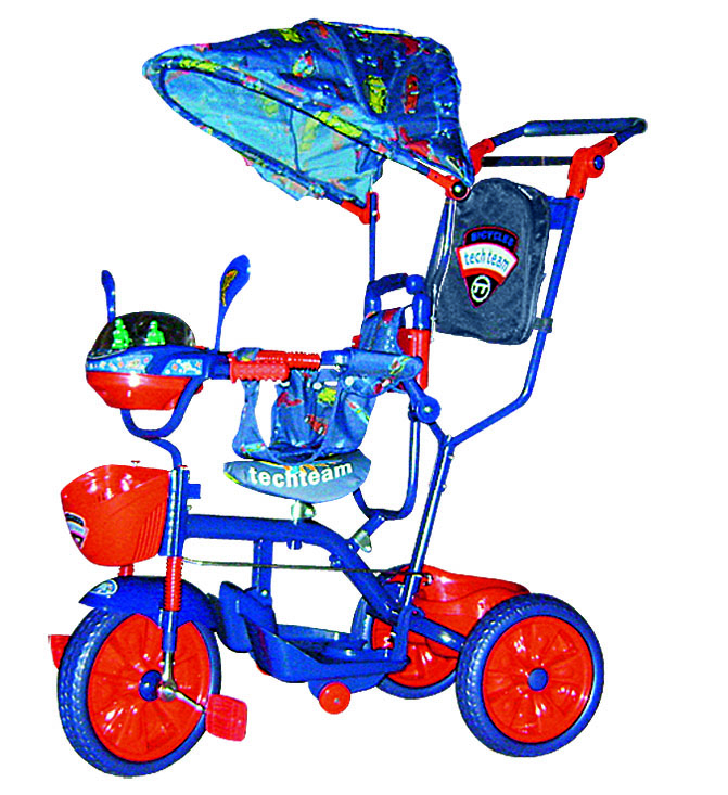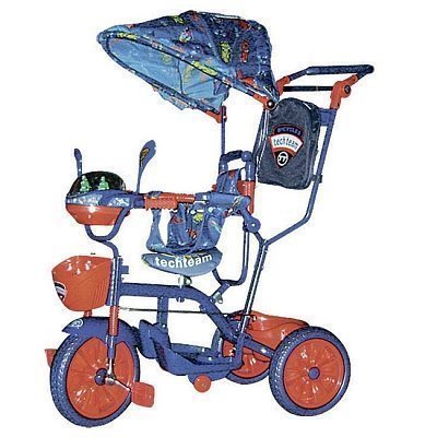 Детский трехколесный велосипед ST108H1 Boy оборудован ручкой управления, тентом и подножками, что позволяет использовать его как прогулочную коляску для малыша.
